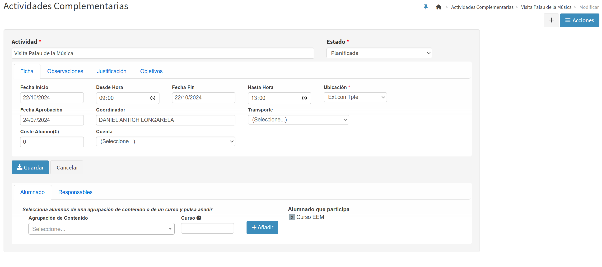Planifica y gestiona las actividades complementarias y extraescolares del centro. Control de inscripciones, autorizaciones, pagos...